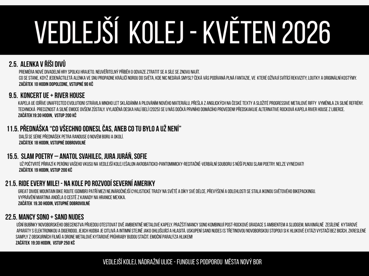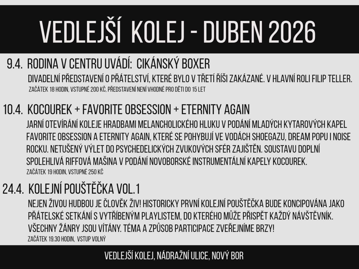 Spolek Vedlejší kolej vytvořil z nepoužívaného nádražního skladiště v Novém Boru otevřený multifunkční prostor „Vedlejší kolej“ , který veřejnosti umožňuje realizace nejrůznějších komunitních aktivit „zdola“, od kulturních (hudba, divadlo, výstavy…) přes společenské (setkávání, promítání, workshopy, kurzy) až po třeba sportovní.